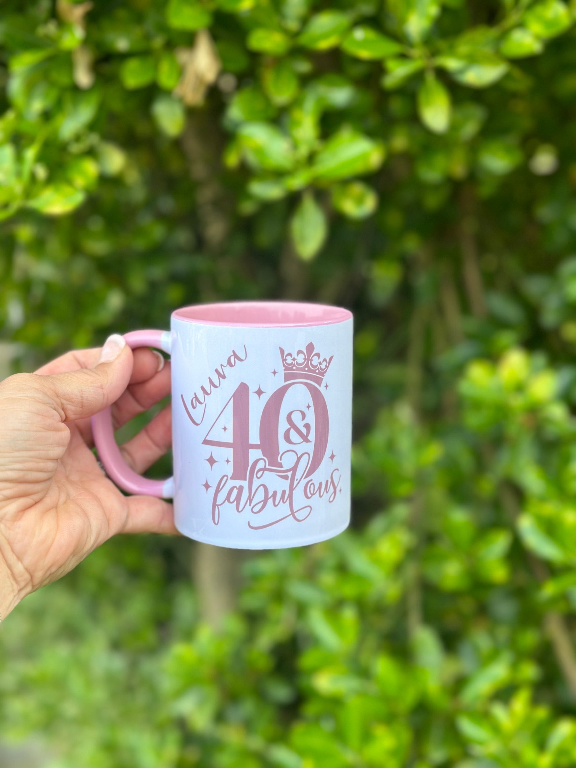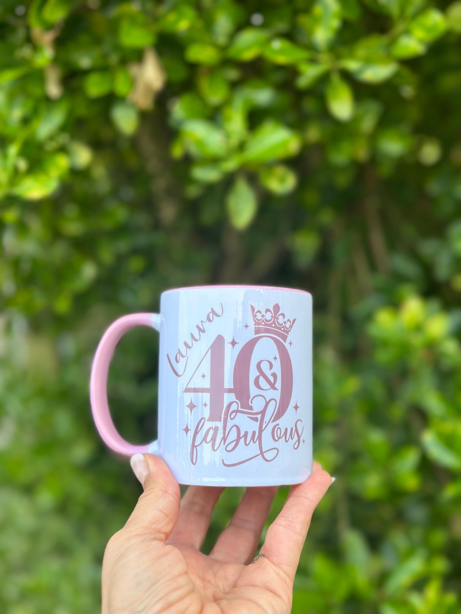 This fantastic mug design makes a great gift for any fabulous 40 year old! Personalised with recipients name and the design “40 & fabulous” printed on both sides onto a top quality mug which has a pink handle and pink insert