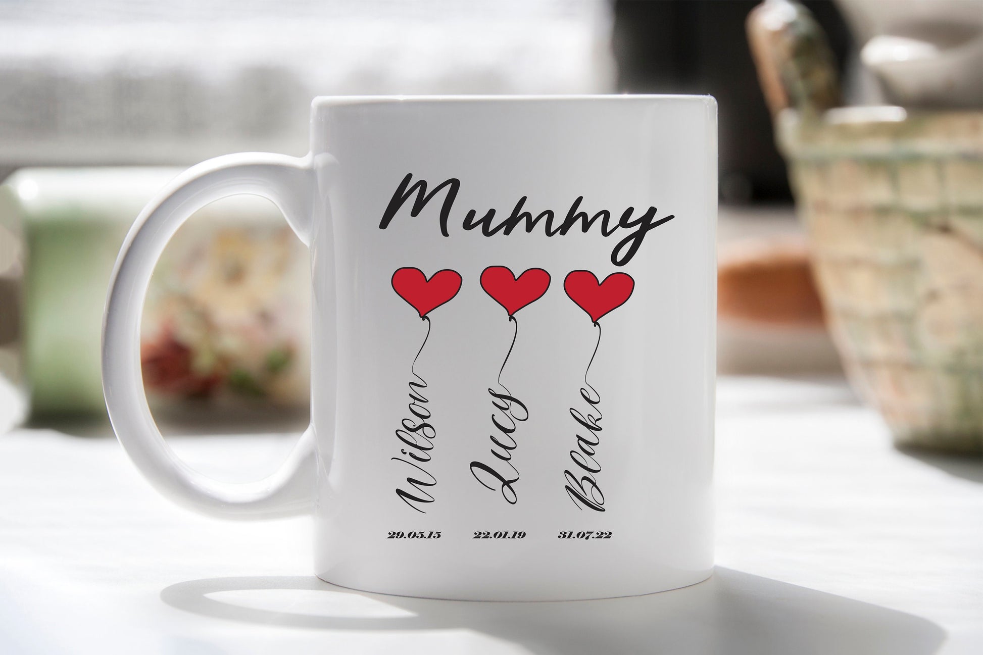 TO PERSONALISE Simply select if you would like one or 2 mugs and 1. Let us know the top text for each mugs - eg mum, mummy, daddy, dad... and 2. Let us know the order of names of the children, left to right - include name and date of birth if you wish for this to be included too.